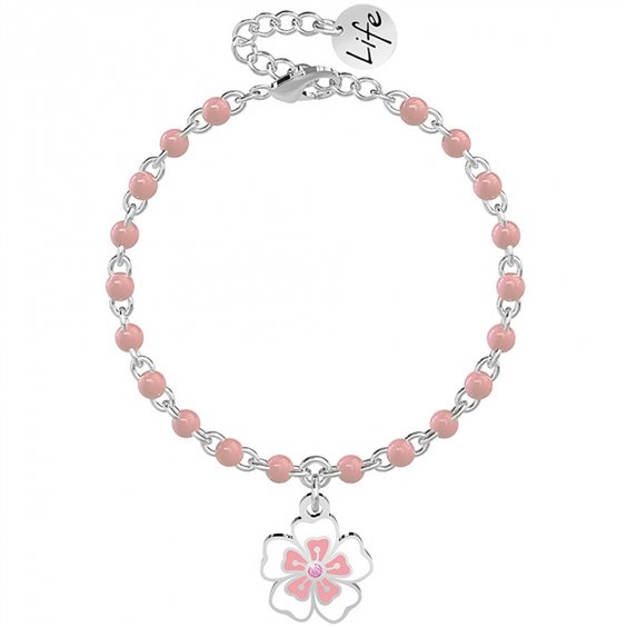 Bracciale Kidult in acciaio ipoallergenico con smalto perline rosa e ciondolo a forma di fiore. " I fiori di ciliegio riempiono di rosa la nostra vita. Per te rinascita, prosperità e purezza durante l'hanami di primavera."
