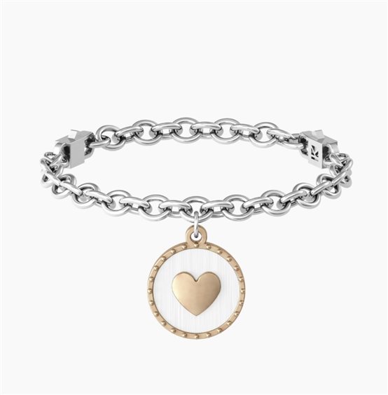 Bracciale in acciaio 316L, lunghezza 19 cm, misura regolabile sistema "COMFORT FIT" (16 cm / 17.5 cm / 19 cm ) con catena rolò, ciondolo satinato e con PVD rosé lucido con borchie, cuore PVD rosé. Scritta: Con te è... mondo. Dimensioni: catena 5 mm, ciond