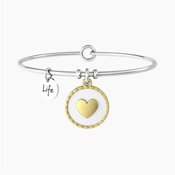 Bracciale bangle in acciaio 316L, circonferenza 20 cm, Ø 6 cm con ciondolo satinato e con PVD giallo lucido con borchie. Scritta: Con te è...mondo. Dimensioni: ciondolo Ø 18 mm