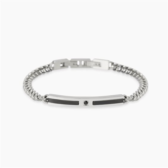 Bracciale in acciaio 316L lucido e satinato, lunghezza regolabile da 19.5 a 21 cm, con catena groumette satinata e spazzolata, piastra lucida e in PVD nero, cristallo nero. Dimensioni: larghezza catena 5.2 mm, piastra 40x5.4 mm, pietra Ø 2 mm