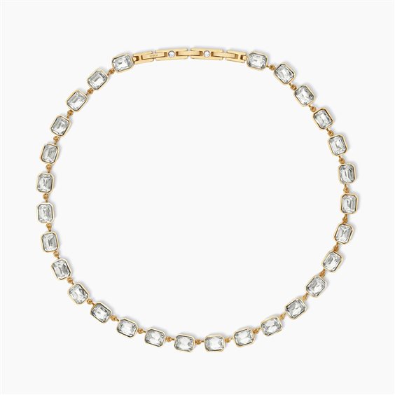 Girocollo regolabile in acciaio dorato con cristalli ottagonali bianchi taglio piccolo. • Diametro cristalli tondi: 3 mm • Dimensione cristalli ottagonali: 8 x 6 mm • Misura regolabile, lunghezza da 39 a 42,5 cm • Materiale: Acciaio 316L, Cristalli, PVD giallo