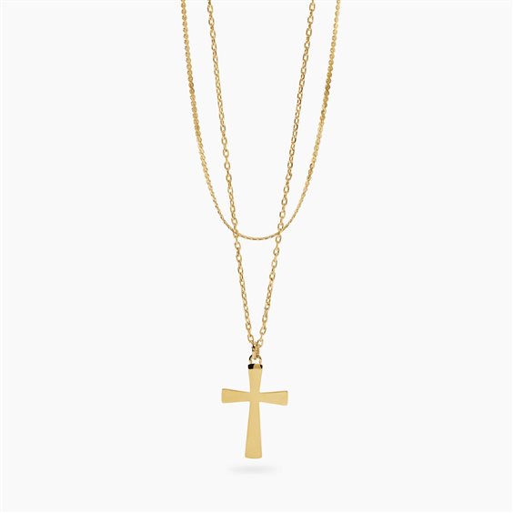 Girocollo in acciaio 316L e PVD giallo, lunghezza regolabile da 38 a 43 cm, con catene serpentina e forzatina diamantata, pendente croce. Dimensioni: serpentina 1.3 mm, forzatina 1.8 mm, croce 17.5x25 mm