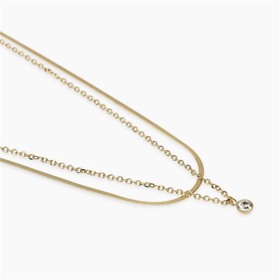 Girocollo in acciaio 316L e PVD giallo, lunghezza regolabile da 38 a 43 cm, con catene forzatina diamantata e herringbone, pendente con cristallo. Dimensioni: forzatina 1.8 mm, herringbone 1.8 mm, pietra Ø 4 mm