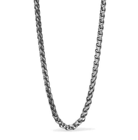 Collana in acciaio 316L satinato e PVD gunmetal, lunghezza 50 cm, con catena spiga. Dimensioni: larghezza catena 4 mm