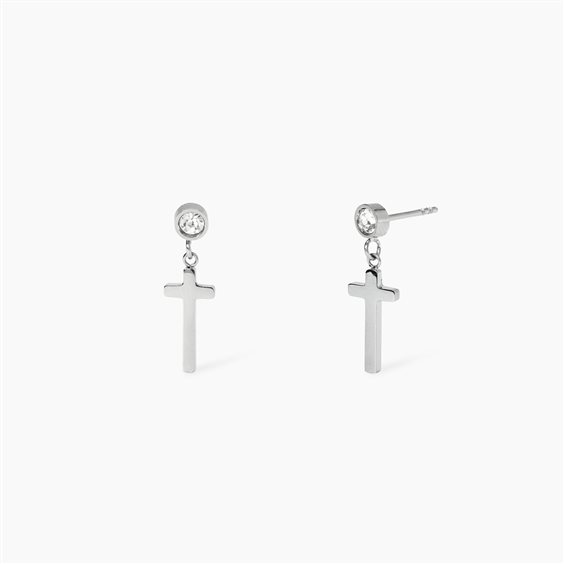 Orecchini in acciaio 316L, lunghezza totale orecchino 2 cm, con pendenti croce e cristalli. Dimensioni: croce 6.6x14 mm, pietre Ø 3.5 mm