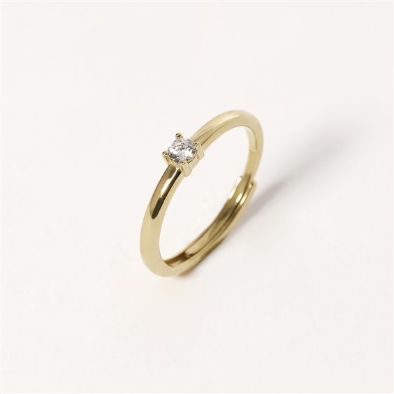 Anello solitario in argento dorato con zircone. • Incastonatura zircone a griffe a tre punte • Diametro dello zircone: 3 mm • Misura regolabile, da 9 a 17 • Materiale: Argento 925, Zirconi