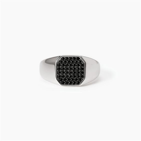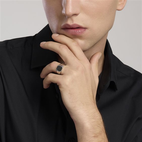 Anello regolabile da uomo in argento rodiato con zirconi neri. • Misura regolabile, dalla taglia 19 alla 27 • Dimensioni degli zirconi: 1,25 mm • Materiale: Argento 925, Zircone