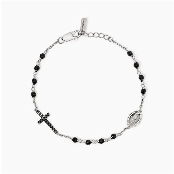 Bracciale regolabile da uomo in argento rodiato con catena forzatina, agata nera sfaccettata, zirconi neri, croce e Madonnina. • Dimensione elemento croce: 17 x 17,5 mm • Dimensione elemento madonnina: 10.5 x 7,5 mm • Diametro agata nera: 3-3,5 mm • Diametro degli zirconi: 1,5 mm • Lunghezza regolabile da 19 a 21 cm • Materiale: Argento 925, Agata, Zirconi