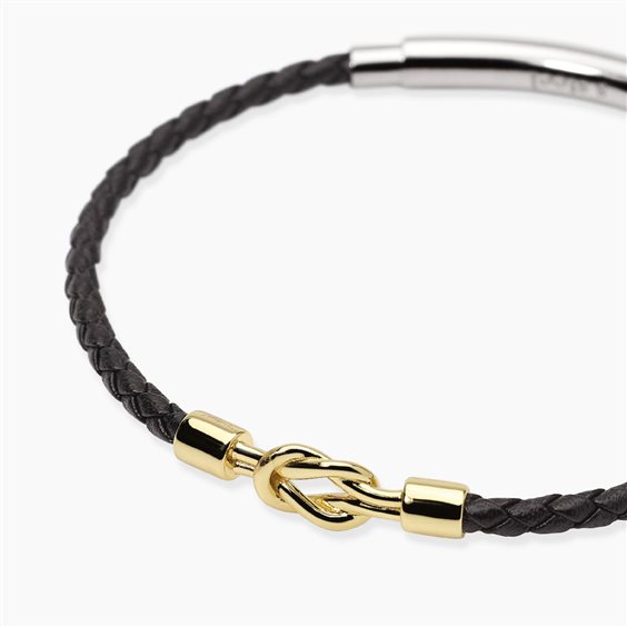 Bracciale in cuoio nero, argento 925 placcato oro giallo 18 Kt e acciaio 316L. Inserto "nodo" centrale cm 2,5. Chiusura in acciaio 315L. Misura regolabile da cm 18 a cm 20.