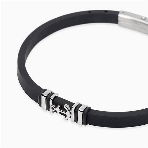 Bracciale in silicone nero, argento 925 e acciaio. Chiusura in acciaio 316L. Misura regolabile da cm 18,5 a cm 21,5.