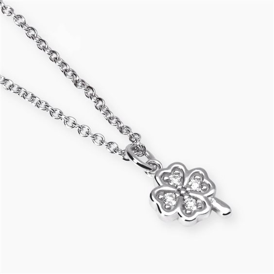 Girocollo in argento 925/°°° rodiato e diamanti LAB-GROWN. Catena maglia rolò. Quadrifoglio pendente mm 8 con diamanti LAB-GROWN, colore F, purezza Vs, carati totali 0,04. Misura regolabile da cm 39 a cm 43.