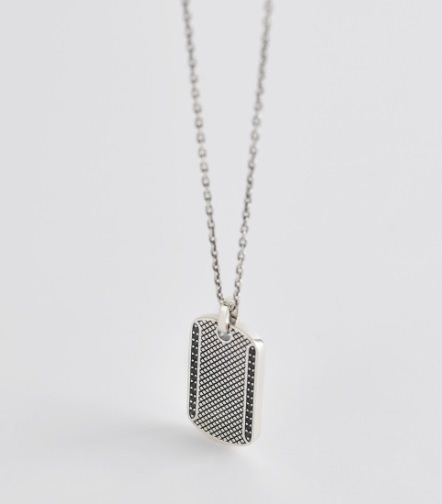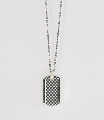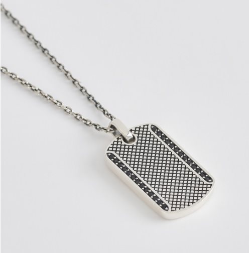 Collana uomo , argento 925 , catena maglia rolò , lunghezza cm 65 , piastrina lunghezza cm 3x1.5 , finiture a rombi con zirconi neri incastonati con griffe. Scatola e garanzia originali.