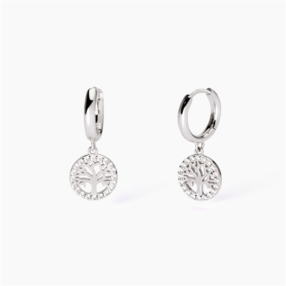 Orecchini da donna in argento rodiato a cerchio con pendenti tondi con albero della vita e zirconi. • Diametro pendente: 10 mm • Diametro degli zirconi: 1,25 mm • Materiale: Argento 925, Zirconi